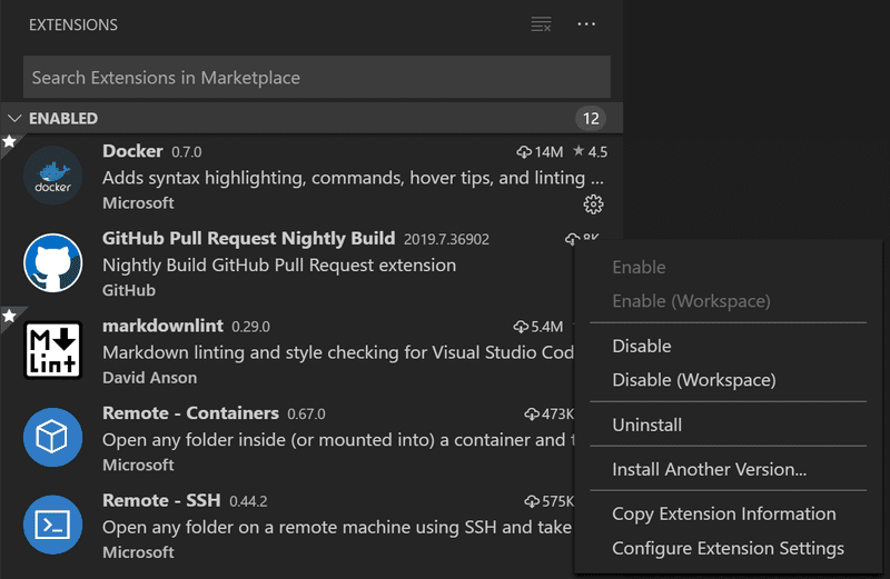 لإلغاء تثبيت أحد الإضافات، اضغط على أيقونة الضبط الموجودة على يمين الإضافة ثم اختر إلغاء التثبيت من القائمة المنسدلة. سيؤدي هذا إلى إلغاء تثبيت الإضافة ويطلب منك بإعادة تشغيل VSCode.